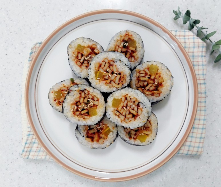 김밥 말기 : 김 위에 밥을 고르게 펼치고 볶은 어묵을 올립니다. 그 위에 원하는 채소(예: 단무지, 오이 등)를 추가한 후, 김을 말아줍니다.